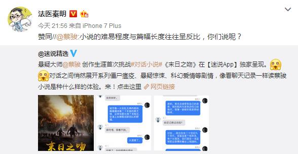 谈到自己首次创作对话小说的经历,蔡骏称这是突破以往所有创作经验的一场“冒险”。他在微博上与粉丝互动时表示:“小说的难易程度与篇幅长度往往呈反比,你们说呢?”获得了网红法医、悬疑作家秦明的赞同。