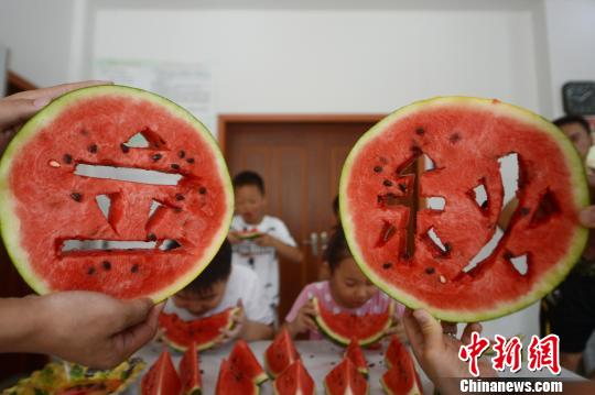 图为立秋之日,孩童“啃秋”盼凉爽。 崔佳明 摄