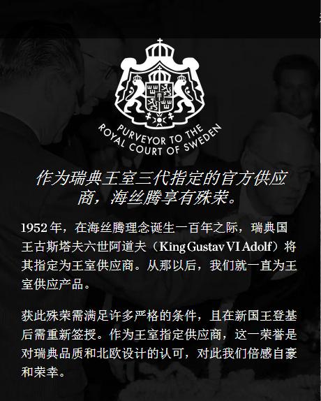 1952 年,海丝腾迎来一位耀眼嘉宾,同是也收到一份至高荣誉,原来是瑞典国王古斯塔夫六世·阿道夫,准备前来参加海丝腾创始百周年的庆典活动,“一直被雪平人民爱戴的瑞典国王要来海丝腾了!”这个大好消息迅速传递开来,鼓舞着每一位海丝腾成员,欢庆典礼上,国王古斯塔夫六世宣布:指定海丝腾为王室寝具供应商。
