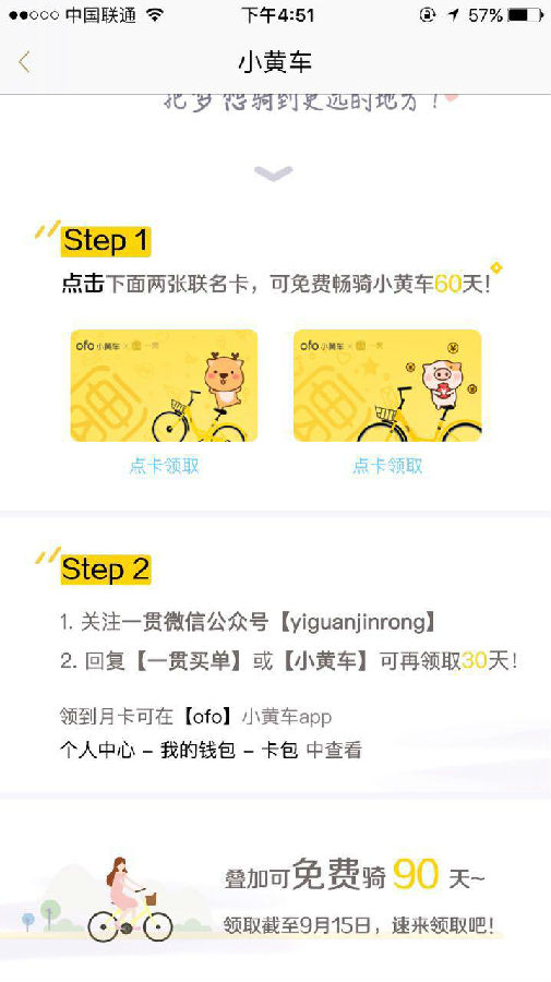 如图所示,低级下面两张联名卡,即可获得免费畅骑小黄车60天!如果不够,再按照提示,关注一贯微信公众号【yiguanjinrong】,回复【一贯买单】或【小黄车】即可再领取30天免费骑行资格!