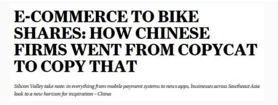 【文/观察者网 王佳璐】据香港《南华早报》9月17日报道,中国摆脱山寨形象;从电子商务到共享单车,越来越多的中国商业模式正在被亚洲各国效仿。