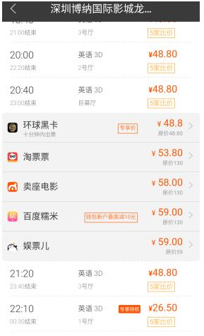 刚好打算和同事一起去看猩球崛起3:终极之战,我就说我来订票,试试环球黑卡刚刚推出的电影票特权。当我选择好电影之后,还有个比价购买,打开一看原来是同个时间段环球黑卡比价了淘票票、卖座电影、百度糯米、娱票儿几个平台的电影票价格,有了这个比价,买票就可以很直观的买到最优惠的那一家了,而作为环球黑卡的会员又可以享有专享价,太棒了。