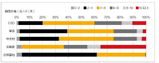 从价格水平看,北京各商圈租赁价格差距大,金融街商圈租赁价格,,为20.6元/㎡/天,总部基地,,为4.7元/㎡/天。从客户的价格需求区间分布来看,总部基地及中关村商圈客户承租能力较低,客户需求价格多在区间6元/㎡/天以下,CBD商圈客户承租能力适中,价格需求空间在6-10元/㎡/天的占比大;金融街客户承租能力最强,租赁需求价格在8元/㎡/天以上的比重远大于其他商圈。