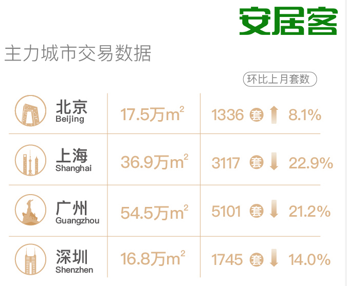 其中上海4月新建商品住宅成交面积为36.9万平方米,环比下跌22.9%;广州为54.5万平方米,环比下跌21.2%;深圳为16.8万平方米,环比下跌14%;一线城市中仅有北京环比上涨,4月成交面积为17.5万平方米,环比上涨8.1%。