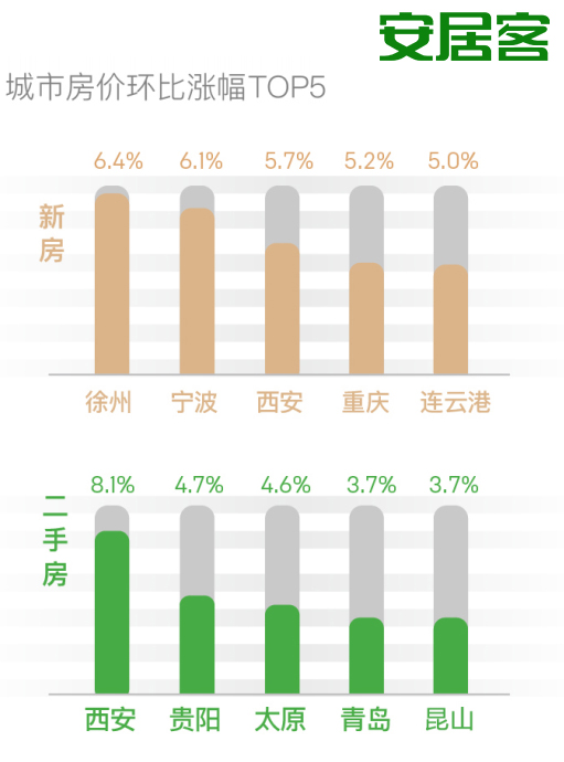 房价涨幅榜上,依旧是三四线城市唱主角。新房涨幅榜上,徐州环比涨幅6.4%、宁波环比涨幅6.1%、西安环比涨幅5.7%,占据前三。二手房涨幅榜上,西安以8.1%的环比涨幅占据榜首。