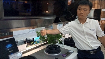 这个操作,老板电器实际用起来怎么样呢?测试人员将手对准操作面板轻轻一摆,油烟机就自动开启了,再一摆它就加大了排烟速度(即一键提速),要关闭一键提速就再次用手掌对准操作面板一摆,便可自动关闭,其感应非常灵敏,使用超级方便。