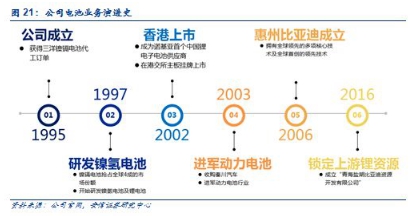 时势造英雄,镍镉电池赚得第一桶金。1995年,比亚迪实业在深圳成立,成立之初即坚持自主开发研制产品,并直接介入供应商的材料开发环节。同年,公司得到台湾,无线电话制造商大霸的认可,获得了三洋的镍铬电池代工订单。1997年,全球电池产品价格暴跌20%到40%,日系厂商处于亏损边缘,公司因此凭借低成本优势先后获得了飞利浦、松下、索尼甚至通用的大额订单。此后3年,公司的镍镉电池便抢占了全球近40%的市场份额,同时开始研发镍氢电池和锂电池。2002年,公司成为诺基亚第一个中国锂离子电池供应商,同年7月在香港主板上市。