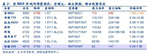 精准定位家用MPV,宋MAX吹响反转号角。实际体验表明2780mm是保障第三排乘坐舒适的,轴距,4款主要竞品均不达标。此外,相比竞品,宋MAX在外观内饰家用化、空间、舒适性和动力性等方面均明显占优。综合来看,公司定位精准,产品综合优势突出,具备成为爆款车型的基因。