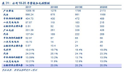 内部深度改革叠加外部政策红利,公司乘用车业务迎来拐点,18-19年产品周期强劲,有望实现V型反转,后续有望持续改善。电池业务放开对外供应,未来计划分拆上市,有望再造一个比亚迪。依托三电核心技术,历时5年研发,公司云轨切入城轨万亿蓝海大市场,国外内订单纷至沓来,2020年后有望成为支撑公司未来5-10年发展的战略支点。大巴和手机组装业务,受补贴下滑和行业需求影响,盈利缓降。三大战略业务方向,公司优势突出,未来持续向好。对此,我们对公司18-20年各项业务的营收和毛利进行了粗略的估计,具体如下。