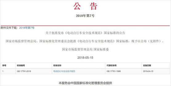 5月17日,根据国家标准管理程序,工业和信息化部组织修订的(GB 17761-2018)《电动自行车安全技术规范》强制性国家标准(以下简称《技术规范》)正式发布,自2019年4月15日正式实施。