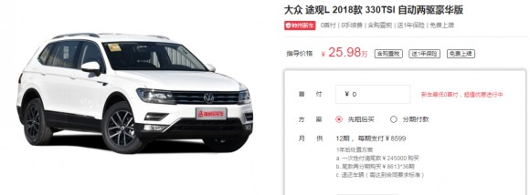 新款途观L,作为高端中型城市SUV的高价值之选,新款途观L是自驾出行的好选择。更时尚科技的外观设计、更宽阔舒适的内部空间、更高效敏捷的动力操控。英姿焕发的气质及飒爽硬朗的线条,诠释了这款SUV洒脱的风格设计,车身加长使得整个空间都更从容,DSG七速湿式双离合器将换挡速度、驾驶乐趣及燃油经济性大幅提升。神州买买车上的大众途观L2018款330TSI自动两驱豪华版,提车,12期月供低至8500元左右,同样享受购置税与一年保险优惠以及尾款分期服务。