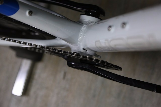 在车架材质上,这款售价 $2199的NOBLE CX-3,却使用了铝合金材质,可能是考虑车架整体强度的原因,车架管材用料比较扎实厚重,在车架焊接上也明显能够看到加强。车架五通位置还细心的设置了稳链器的安装座,以保证选手在激烈的比赛竞争中能够更好的保持链条的稳定。车架及前叉也设置了挡泥板的安装口。