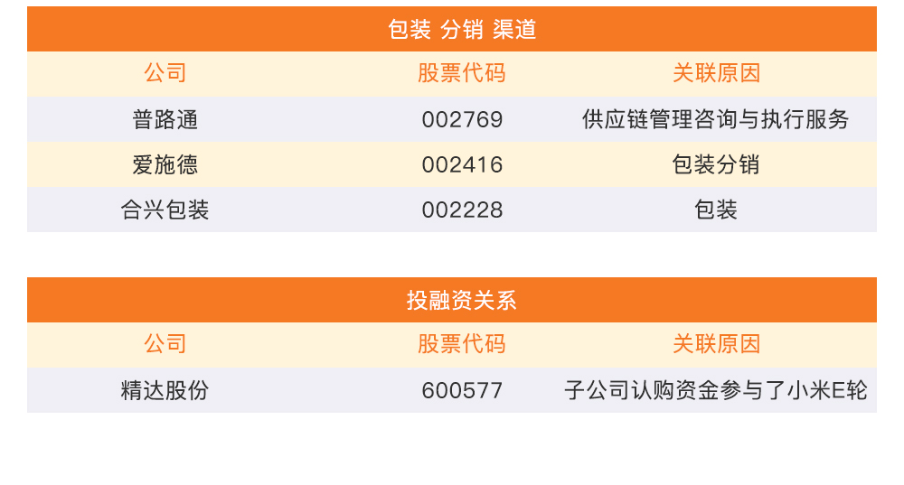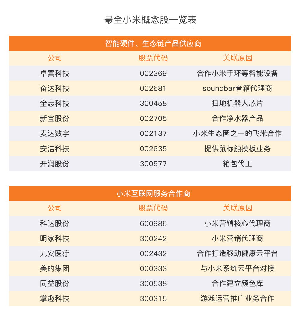 小米智能硬件、生态链产品供应商包括安洁科技、开润股份、卓翼科技、麦达数字、奋达科技、新宝股份、全志科技。小米互联网服务合作商则包括科达股份、掌趣科技、同益股份、美的集团、九安医疗、名家科技。小米包装、分销、渠道有关的上市公司有普路通、爱施德、合兴包装等。小米手机以及周边供应商比较多,包括三环集团、长信科技、宇环数控、欣旺达、欧菲科技、超声电子、劲胜股份等。