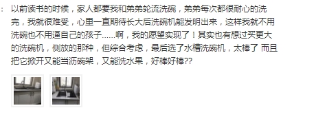 中式小厨房的福音,带娃家庭的标配,拥有一台洗碗机是造福一生的事情,比老公都靠谱”、“从小就期待中式洗碗机可以早点发明出来,现在终于梦想成真了,以后不用像父母一样逼着自己的孩子去洗碗了”、“爸妈眼睛不好,希望他们可以吃到更加干净的碗碟和蔬菜”、“同时讨好媳妇和母上大人的利器,妈妈和未来的媳妇都不用洗碗洗菜了”。