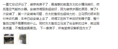 “方太售后服务真棒,下单前免费上门量尺、安装专业,施工现场收拾干净”、“因为装修步骤,推了4次安装,安装出了问题,及时解决”下一套房子,所有厨电设备都选方太”“从订货发货再到安装回访,都做的很到位,让客户很暖心”。
