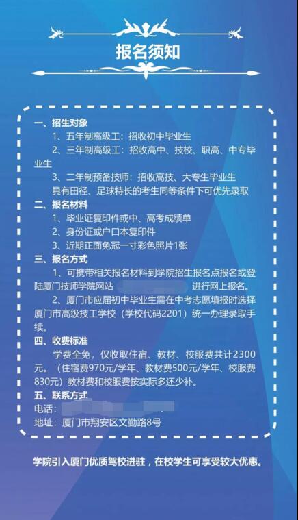 学院学生在校期间学费全免,仅收取住宿费、教材费、校服费。部分学生还依法享受2000元国家助学金,优秀学生有机会获,奖学金5000元。根据相关文件精神,学生从厦门技师学院毕业后,取得,工、技师、,技师职业资格证书的,在公务员录用、企事业单位招聘、专业技术人员考试、工龄计算等方面分别与大专、本科学历人员同等对待;取得人力资源行政部核发的中级工以上职业资格证书,在厦门就业后,达到相应条件的,经本人申请、由所在单位协办,可将户口迁入厦门市。