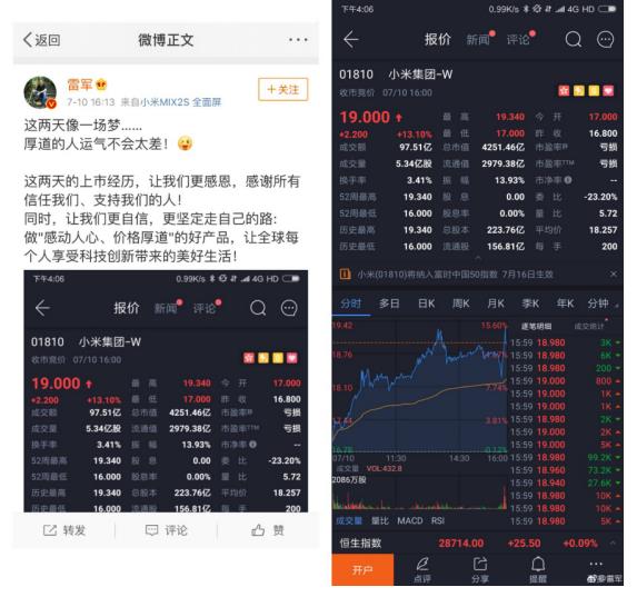 小米上市第二日股价开始强劲反弹,小鹏汽车董事长何小鹏也发表微博隔空“表白”小米和雷军,称自己“昨天和今天也通过二级市场,买了和拥有超过一亿美元的小米(感谢已经赚了点)”,并将小米股价涨至18.1港币的股价截图晒出,引得不少网友在评论中调侃“一夜小赚了1千万美金”。巧合的是,不少人发现何小鹏晒出的股价截图也正是雷军晒小米股价、吴晓波二十年来第一次开通股票账户所选择的富途证券的交易软件“富途牛牛”。