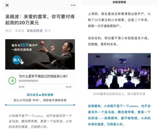 小米上市前,的周日,,财经作家吴晓波在其微信公众号推送了题为《吴晓波:亲爱的雷军,你可要对得起我的20万美元》的文章,轻松收获10万+阅读,文中写到:
