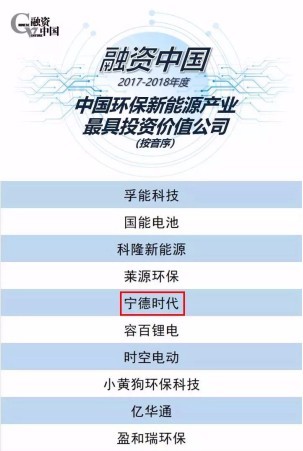 宁德时代荣获“融资中国2017-2018年度中国环保新能源产业,投资价值公司”