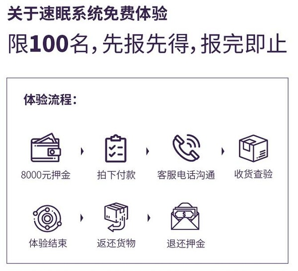 为期1个月的速眠系统体验,若是你感兴趣想去体验,具体报名方式主要有两种:其一,进入速眠官网,点击“速眠商城”,押金缴纳,即报名成功;其二,关注“速眠”微信公众号,点击“免费体验”,押金缴纳后即报名成功。