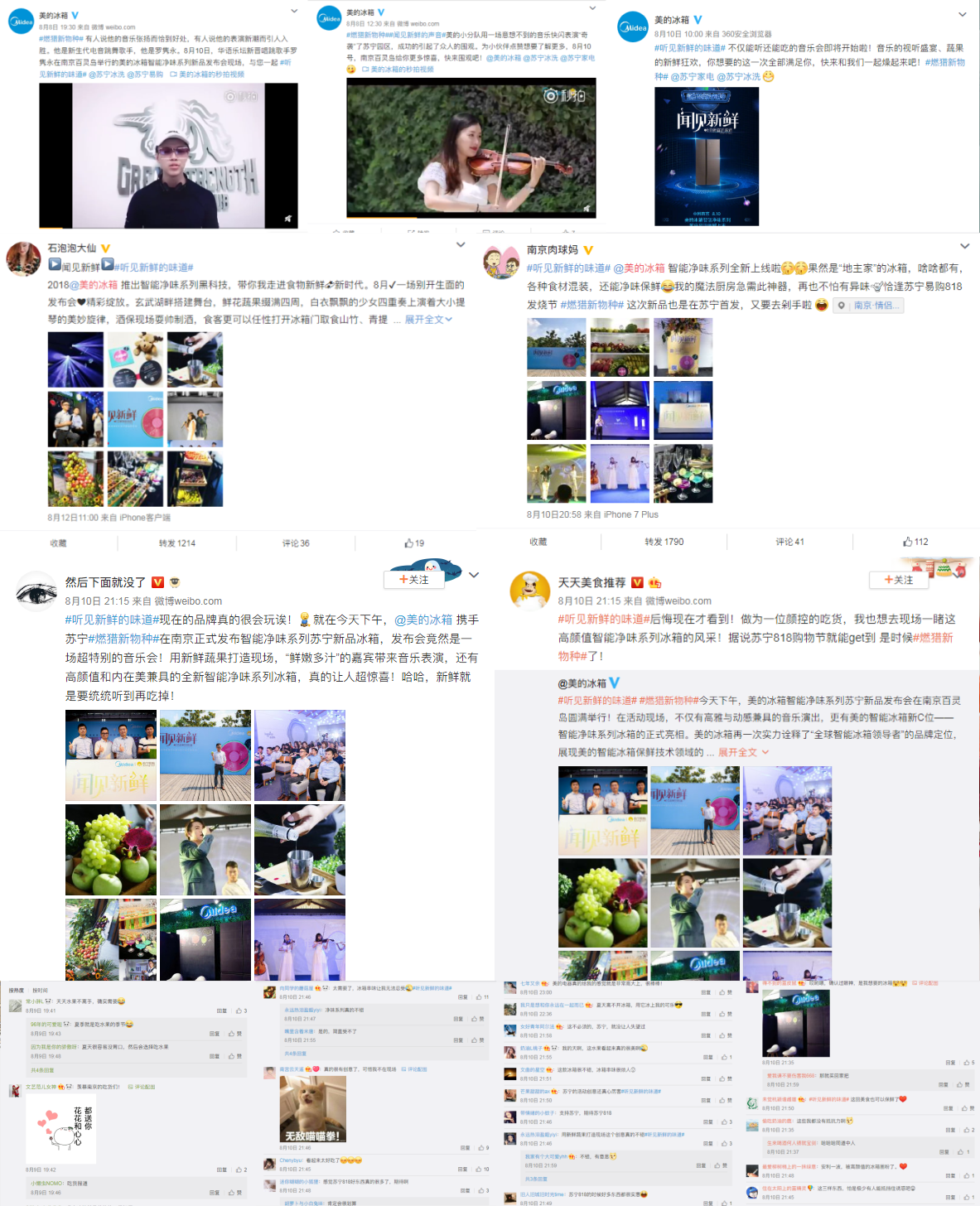 线下发布会火热进行的同时,线上也在蓄力传播。基于强大的品牌影响力,美的冰箱召集多名明星和网络红人KOL参与发布会,线上发布图文助力活动信息曝光;而后美的官微积极转发互动,形成传播闭环。不仅如此,活动现场更设有专属直播间对新品发布进行同步直播,将发布会盛况一览无余的传递给广大消费者,线上线下两个现场相融合,最终实现品牌声量和本次发布会的品牌影响力的双提升。