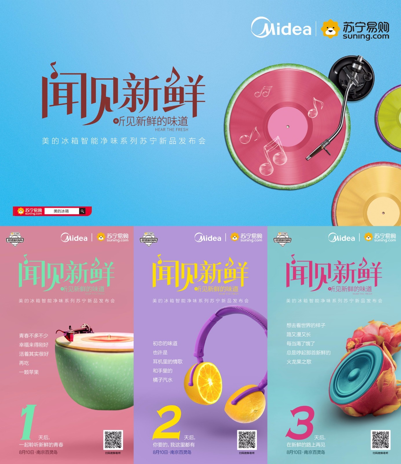 临近发布会时,美的冰箱围绕“闻见新鲜——听见新鲜的味道”主题创作并发布系列创意海报,新鲜水果与音乐元素的,结合,搭配小清新文案,输出产品价值和情感态度,也进一步为新品发布会造势预热。