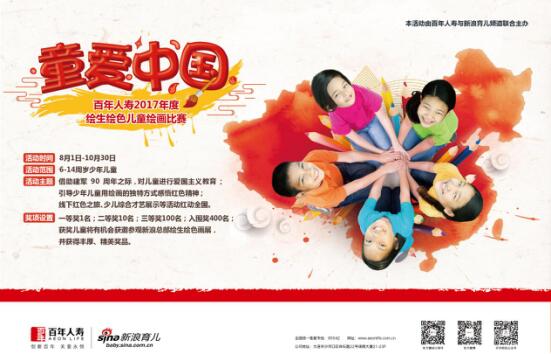 2017年8月1日,中国人民解放军建军90周年纪念之际,百年人寿携手新浪育儿频道联合主办的“童爱中国”绘生绘色儿童绘画比赛正式启动。本次活动鼓励孩子们拿起画笔描绘心中的祖国,也为更多家长们打开一扇门,透过小小画作走进孩子的内心“视界”,在今后的成长路上融入更多的理解与鼓励,与孩子“大手牵小手”肩并肩前行。