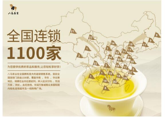 马茶业近两年市场拓展迅速,去年平均每2天开1家新店。现八马茶业全国连锁门店已超1100家!覆盖华南、华东、华北等地区共31个省级行政区。八马的连锁业态分布购物广场、超市、酒店、会所、临街等,满足不同区域市场特点,适应不同商业形态及客户发展需求。积累总结全1100家门店的成功运营经营,八马拥又一套成熟的运营模式,推广快,成效迅速,给所有加盟合作伙伴提供了可靠保障。