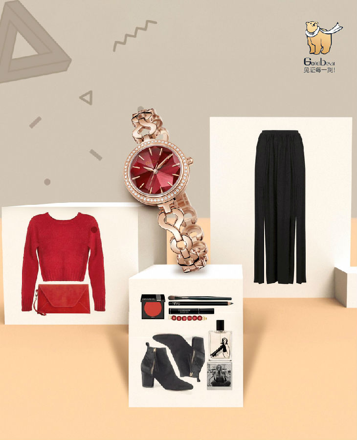 红色羊毛短毛衣与独特剪裁的开叉黑裤凸显身材的高挑,中跟切尔西裸靴简洁优雅,打造活力十足又摩登复古的风格。不规则的长裤随性帅气,简约而不乏惊喜。腕上的Goldbear慕妍手链女表精巧柔美,雪花式切割面表镜随着光影折射出无限光彩,提升了整体穿搭的时髦度和精致感!