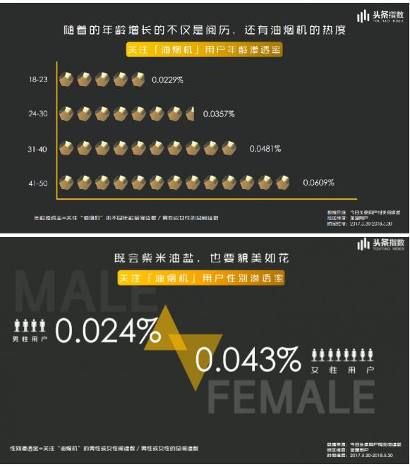 据相关市场调研机构数据显示,近年来吸油烟机销售规模一路,,在未来几年或将占据厨房家电行业的榜首。预计到2020年,中国将新增1.3亿住宅单位,拉动3247 亿元吸油烟机销售。头条指数显示,年龄越大的人群,对于油烟机的关注度,。而作为厨房一把手的家庭主妇/女性用户,也更需要油烟机为他们保驾护航。