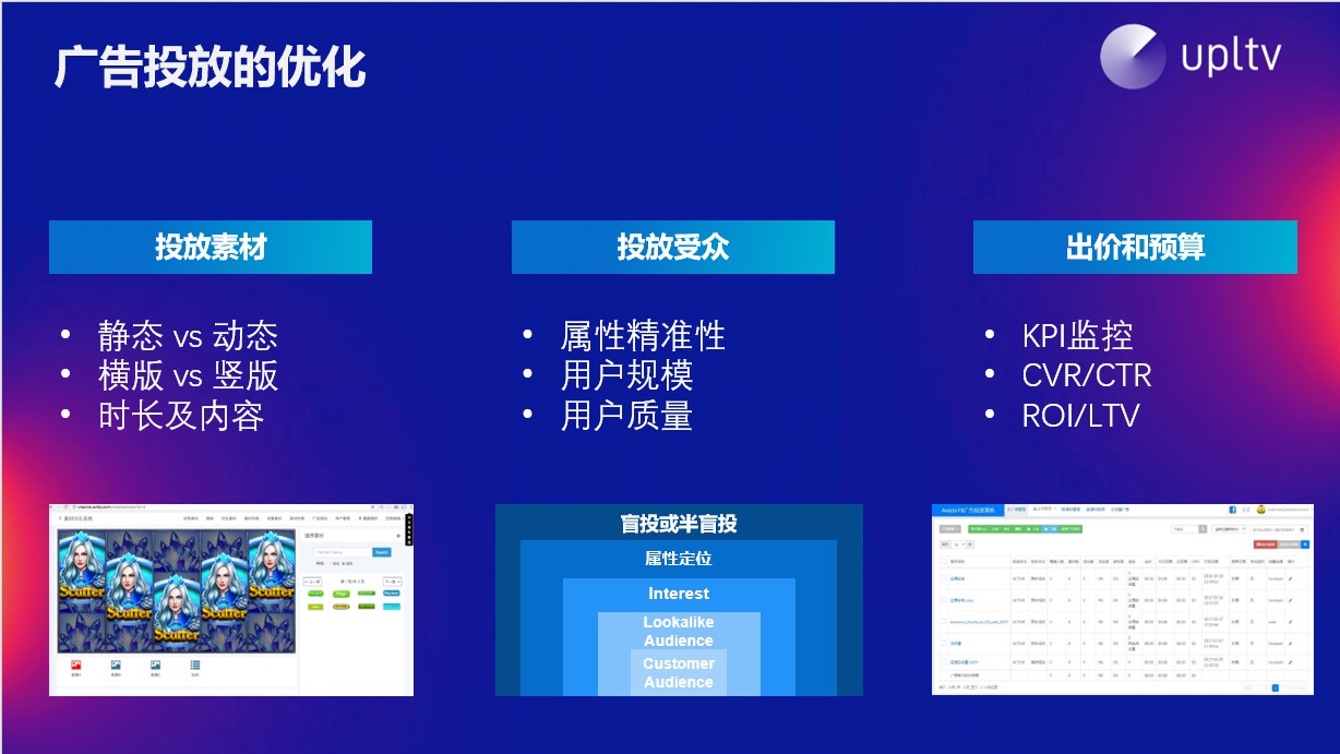 UPLTV专注游戏出海广告服务,自研聚合广告产品接入多家广告平台,运用先进的算法优化广告逻辑,显著提升广告收益并可实现精准用户级广告收益拆分。同时,我们始终秉持公开诚信的服务理念,竭力帮助多的游戏,们,赋能中国创造的游戏绽放全球。