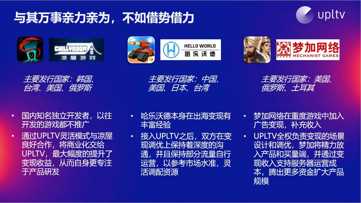 UPLTV从市场角度竭力帮助更多的,们提升游戏收益。作为独立开发商的凉屋游戏,他们的,在制作更好的产品上,因此将商业化托付给UPLTV;富有出海经验的哈乐沃德,在接入与UPLTV后,始终保持深度沟通,共同探讨市场动向;对于重度游戏厂商梦加网络,他们更侧重游戏的内购,将广告变现的设计和调优全权交由UPLTV打理,作为收入补充。