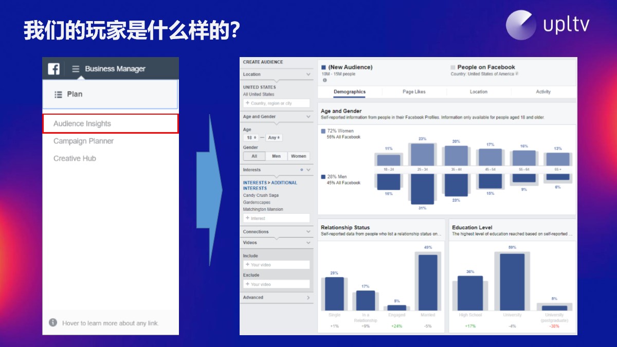 UPLTV推荐,们使用Facebook Business Manager后台的Audience insights工具,可以帮助验证更加明确的目标受众,给到,更精细的玩家画像。