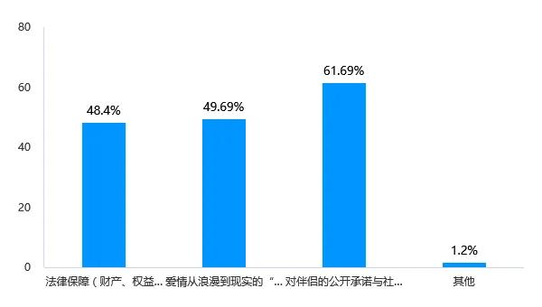 超过六成受访者选择“对伴侣的公开承诺与社会认可”,显著高于其他选项,表明社会关系的正式化是领证行为的关键驱动力。