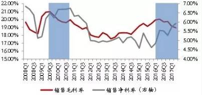 从历史上来看,09 年-10 年也曾经出现过类似的情况。在“四万亿”政策的刺激下,09 年国内经济增速出现了显著回升,上市公司净利润增速也出现攀升,并且在10 年一季度到达110%的阶段性高点,而当季上市公司经营性净现金流却同比大幅下滑1723 亿元;同样,随着原材料价格加速上涨,上市公司毛利率在09 年三季度见顶,之后一路下滑,但净利率却依然在震荡上行。从这两点背离来看,09 年到11 年的情况与现在如出一辙。