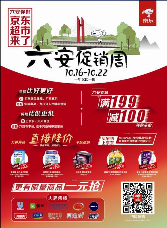 随着热热闹闹的“京东超市六安促销周”(10月16日至10月22日)本周三进入“中场高潮”,无论是皋城的大街小巷、连锁超市、社区便利店,还是户外大屏、朋友圈、新闻客户端,都被一片“红色京东”标志所占据。作为全面布局三四线城市的渠道下沉战略的重要组成部分,本次作为全国线上线下最大超市的京东超市,不仅为红色六安市民带来了“满199减100”、“精选商品一元抢”、“直接降价”等多个非常实惠的促销,还期待借着此次与革命老区百姓的零距离接触,让更多六安百姓了解京东超市正品低价的线上商品与便捷购物的服务。