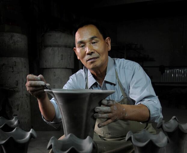 韩进富老师在手工制作会理绿陶作品