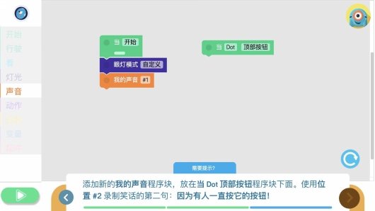 然后组合到一起,就可以让达达(Dot)实现右转90度,然后向上看,所有灯变成红色,然后说嗨。通过编程赋予了小机器人生命力,是不是很有趣呢?