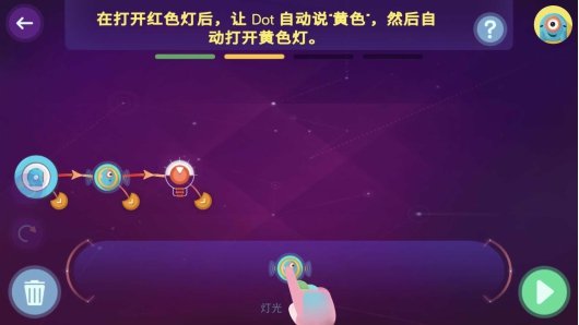 Wonder的指令下发方式就比较有趣,你可以通过拖拽的方式,将想让达达(Dot)实现的动作对应的指令模块一个个用逻辑连线,就像画画一样,十分有趣。比如说让达达(Dot)亮红灯后说出红灯,再亮黄灯,你可以将对应的指令模块拖到画面上,以连线形式把逻辑串连起来。
