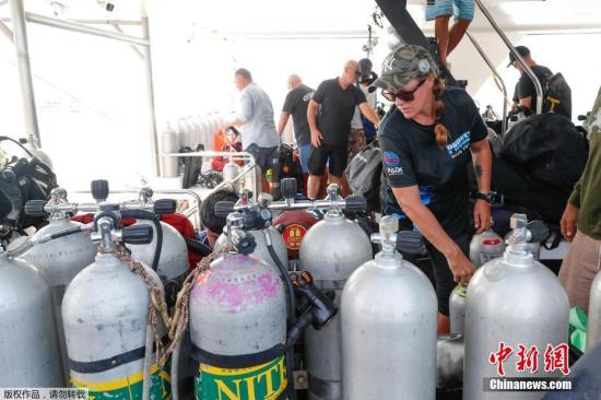 当地时间2018年7月7日,泰国吉岛海域附近,潜水员检查船上的氧气罐,准备进行搜救工作。当地时间7月5日17时45分许,两艘载有中国游客的游船在泰国普吉岛附近海域突遇特大暴风雨发生倾覆事故。