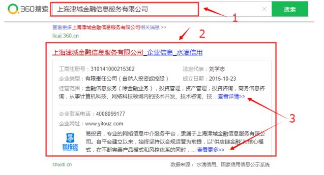 易投资用户可以通过“360搜索”,在搜索框填写“上海津城金融信息服务有限公司”,然后点击“搜索”,查看到公司相关“企业信用、水滴信用”词条,点击“查看详情、查看更多”。