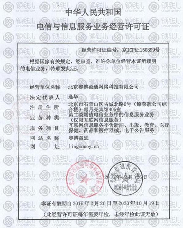 领钱儿从上线之初,便成功申请了“ICP经营许可证”。