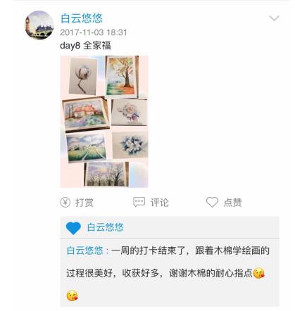 当初会选择使用知识圈做打卡活动主要是有两方面的原因:一个是通过转发能吸引一些对绘画感兴趣的新学员加入进来;另外学员他们把这个打卡活动当做一个很有趣的游戏,可以练习又可以提升自己。因为绘画是一件有点枯燥的事,一个人就很难坚持,但是一群人热热闹闹的在一个群里,天天以打卡的形式,就好像在玩一个小游戏,这样很多人就能坚持而且会觉得绘画很好玩。