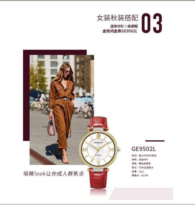 层林尽染的秋天是个妖娆的季节,各种竞相亮相的流行元素让人眼花缭乱,浓浓的秋日气息中,魅力十足的搭配装扮方能紧跟时尚潮流。2018最潮的秋装搭配都在这里,跟随Goldbear金表一起感受下今秋,的流行元素吧。