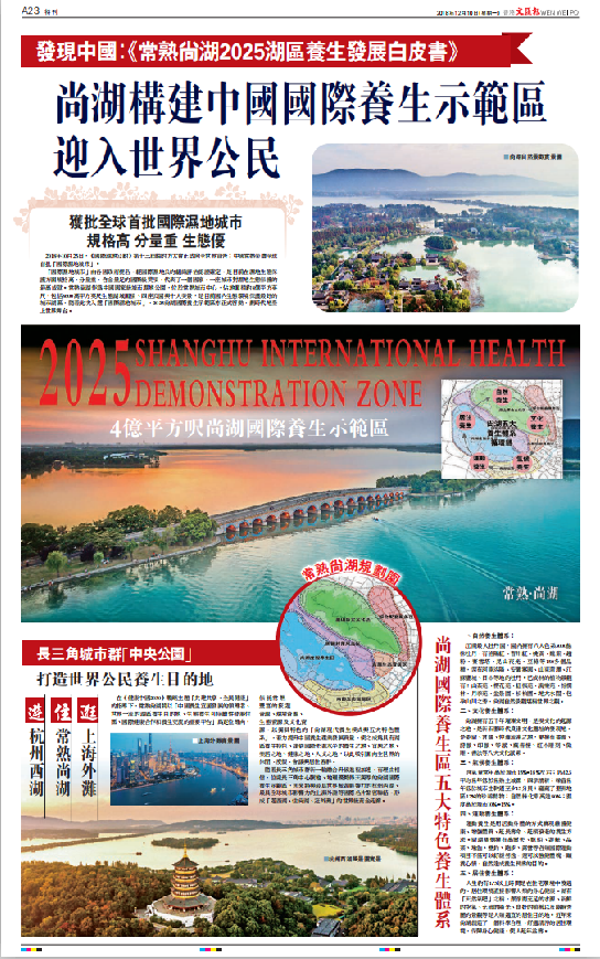 2018年12月10日,香港《文汇报》整版刊登一篇题为《尚湖构建中国国际养生示范区》的重磅报道,全方位专门深入报道内地长三角城市常熟以及尚湖,引发全港瞩目。据悉,对一座内地县级城市如此不惜版面“大动干戈”,这在港媒历史上尚属,,其关注效应截止目前仍在持续发酵。