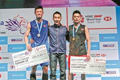 颁奖时,林丹从“一生之敌”李宗伟手中接过,奖杯,这也是林丹时隔两年之后,再次获得,联赛的男单,。