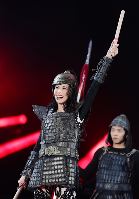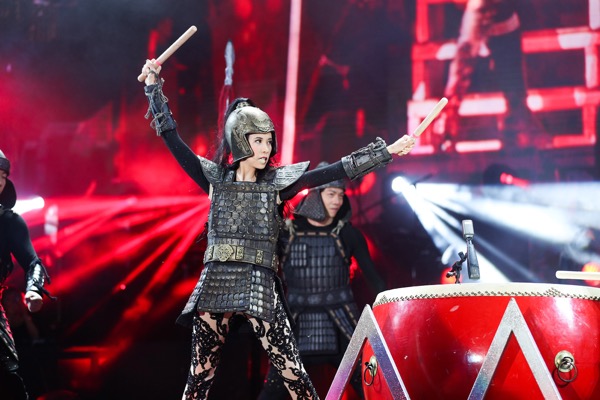 莫文蔚的旅行也给她的绝色舞台带来了令人惊喜的变化。她在华清池观看了中国首部大型实景历史舞剧《长恨歌》,只一眼就爱上了那件雍容华美的凤袍。经过真诚的沟通,她如愿将这身凤袍穿到了绝色舞台上,成为了她在咸阳站的开场亮相造型,灯光打亮的一瞬间宛若梦回大唐,全场观众都为之惊叹,被,华美的视觉呈现所倾倒。对于秦都咸阳,莫文蔚也准备了重磅彩蛋,斗鼓环节中,她和舞蹈演员都披挂上了秦国武士的铠甲,英姿飒爽气宇轩昂,使这场斗鼓更添了一份历史的厚重;而到了安可环节,莫文蔚更是把导演视若宝贝的秦俑公仔带上了舞台,在这个古老又神奇的地方,仿佛她随手一伸,就能抓来用之不尽的彩蛋,就像这个城市的每一处,都藏着讲不完的故事。