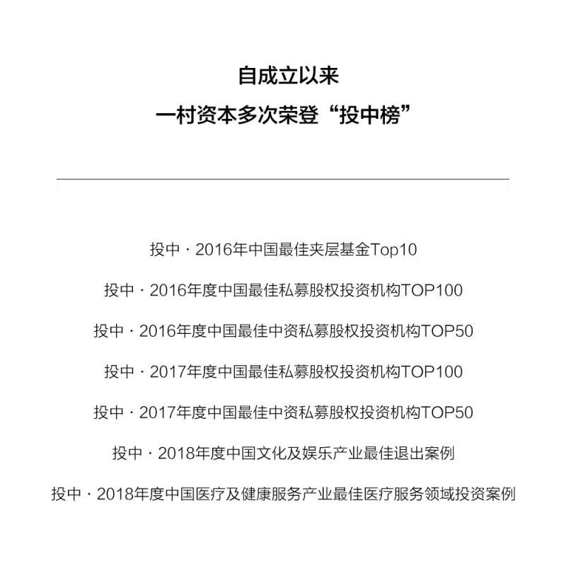 凭借对市场的敏锐洞察和优秀的投资成绩,一村资本荣膺“投中2019年度中国最佳私募股权投资机构,00”和“投中2019年度中国最佳中资私募股权投资机构TOP50”,一村资本参与投资的微盟项目荣登“投中2019年度中国互联网产业最佳退出案例”,0榜单。在此之前,一村资本已多次荣膺投中股权机构百强和中资50强。
