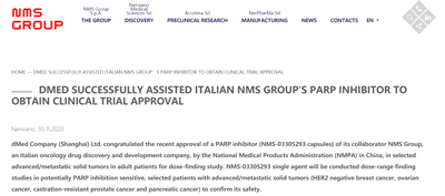 “NMS集团是意大利,的肿瘤药研发公司, 在激酶抑制剂等小分子药物的靶点发现和验证领域拥有丰富的经验及业绩。本次PARP抑制剂NMS-03305293在中国的临床研究的获批,开创了NMS创新药直接惠及中国患者的渠道,有着深远的意义。感谢NMS临床合作伙伴缔脉团队在NMS-03305293中国申报中的鼎力支持,我们将与其他股东一起,持续投入支持NMS集团的创新药管线,让NMS的更多创新药为中国癌症患者提供个性化治疗选择。”
