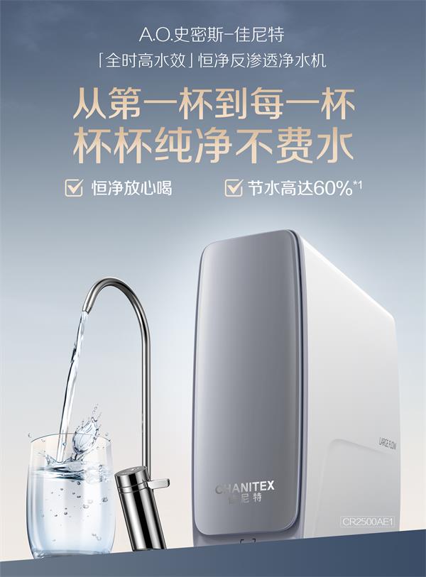 A.O.史密斯-佳尼特「全时高水效」恒净反渗透净水机,搭载“全程净水回流冲洗+净水循环过滤节水技术”,首杯水、杯杯水皆纯净可饮用,,应对全国各地不同水质的复杂环境,带来恒净与节水兼得的全新升级体验,重新定义橱下净水机“恒净、节水、长效”新标准。